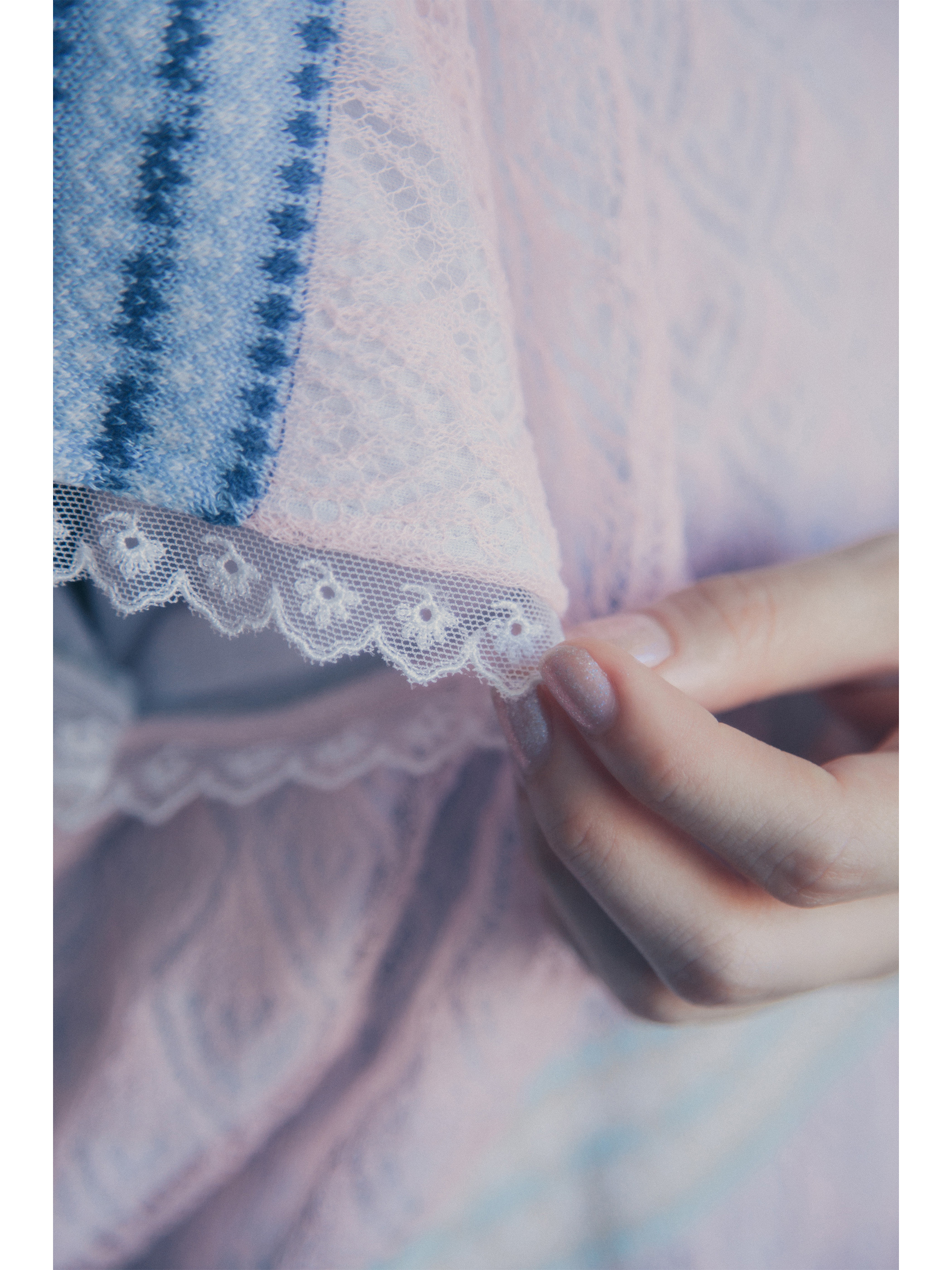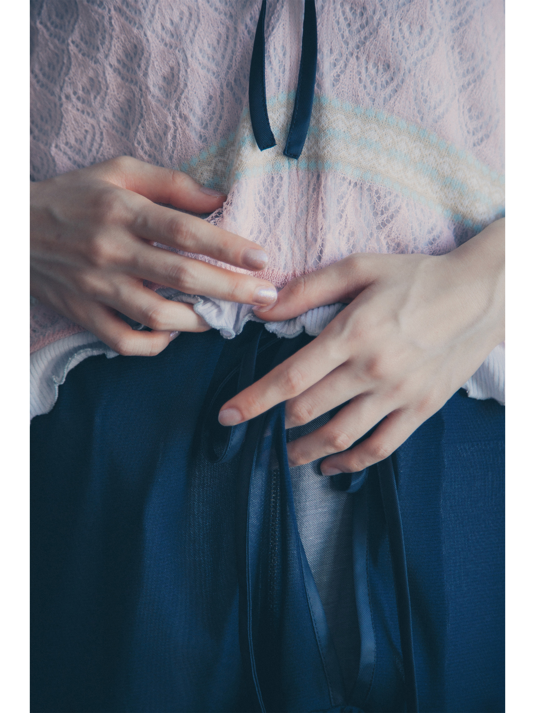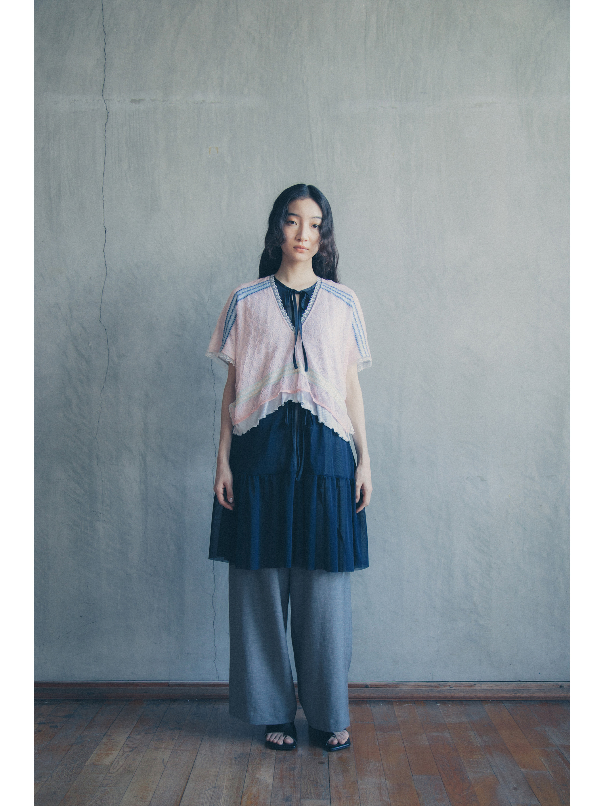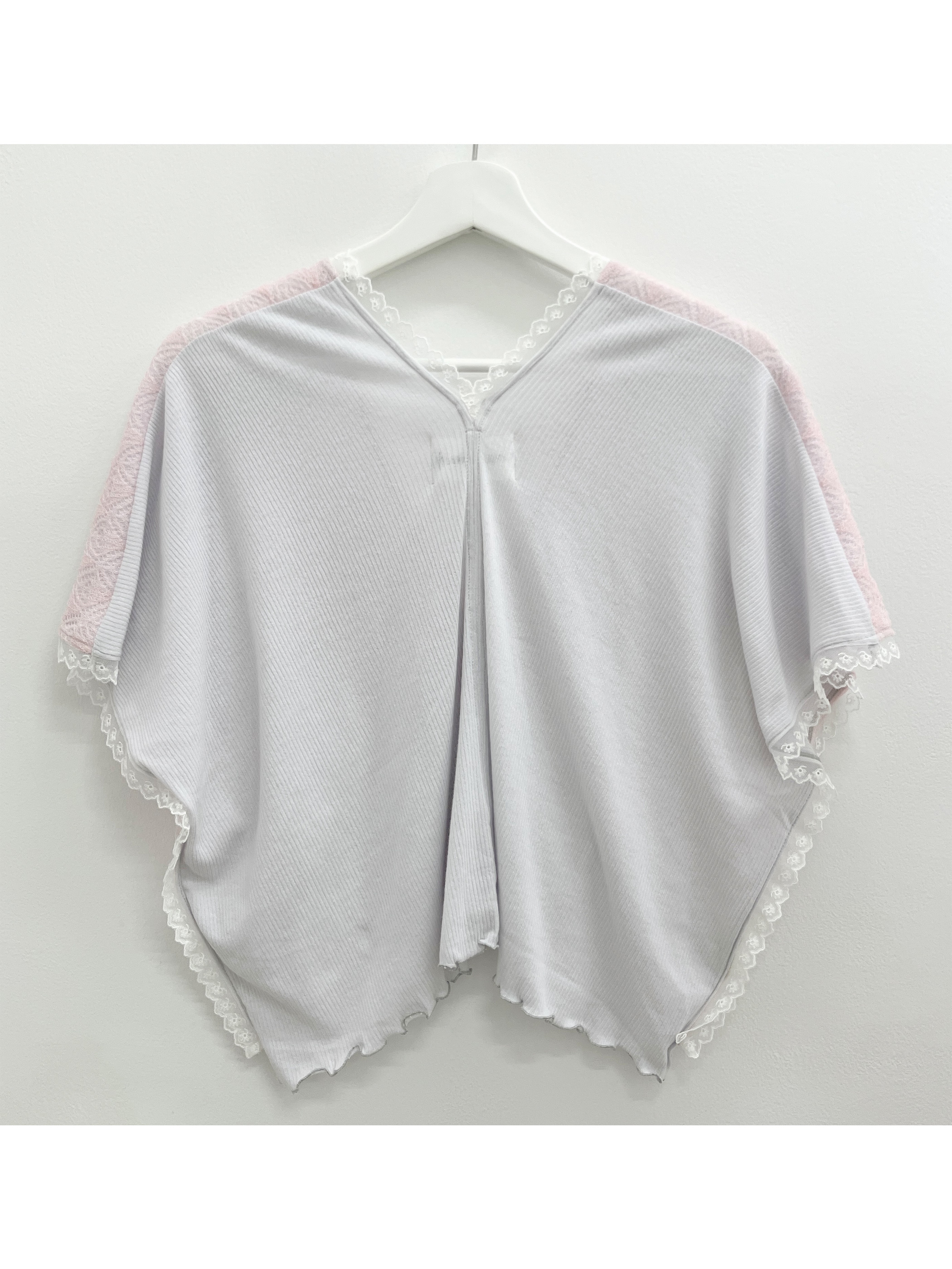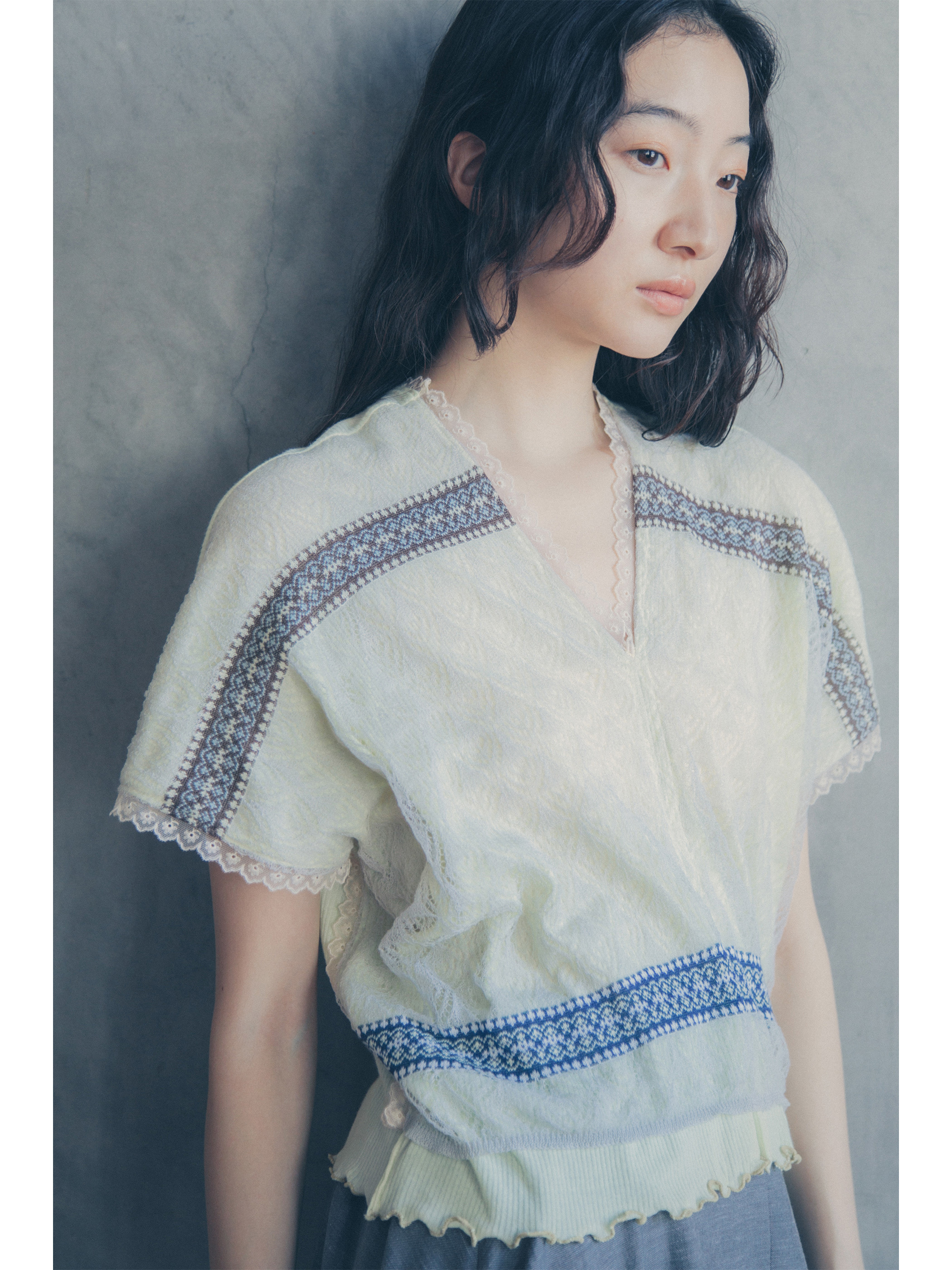 エッジにあしらわれたチュールレースがノスタルジックなムードをプラス。やさしい手触りのシアーリブで清涼感ある着心地を実現します。