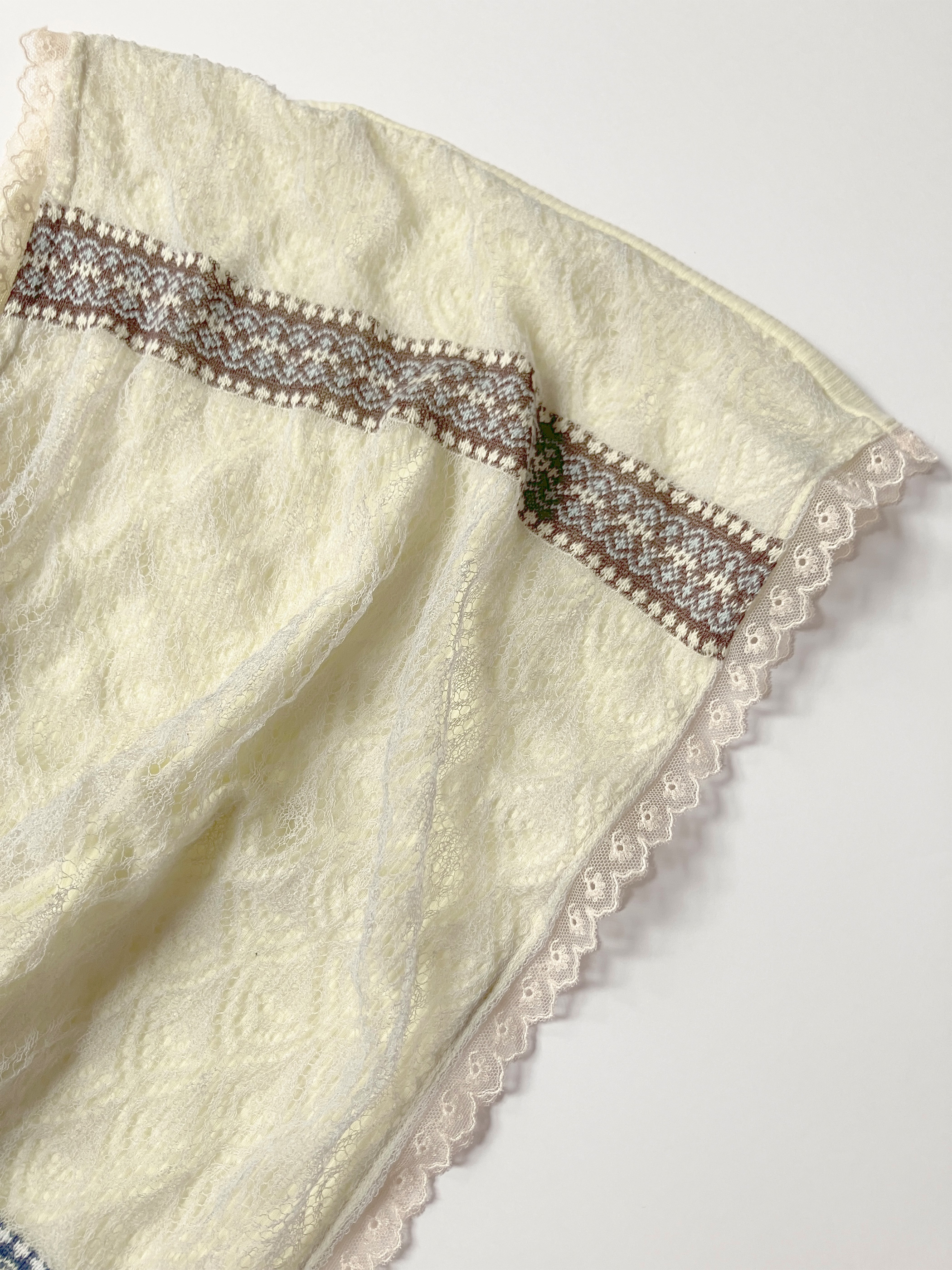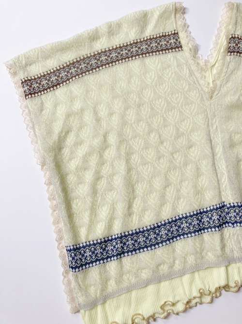 フォークロア調の編み替えがチロリアンテープのようなジャカードレースニット。
