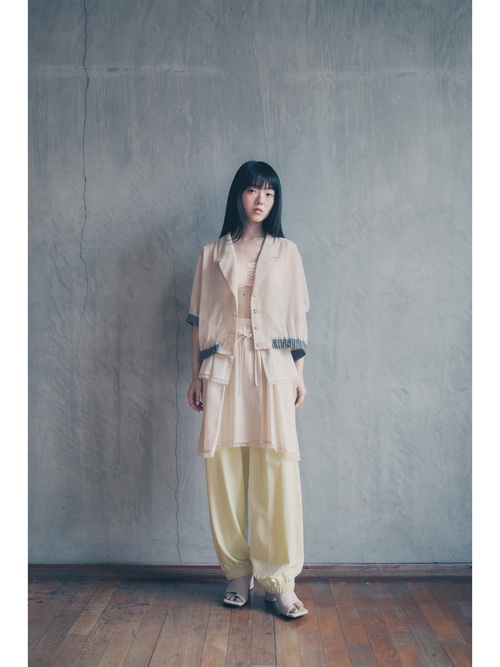 センタータックによりリラックスムードの中にもすっきりした印象に。裾のゴムは絞りすぎないようにし、すとんと落ちるダボつきすぎないシルエット。