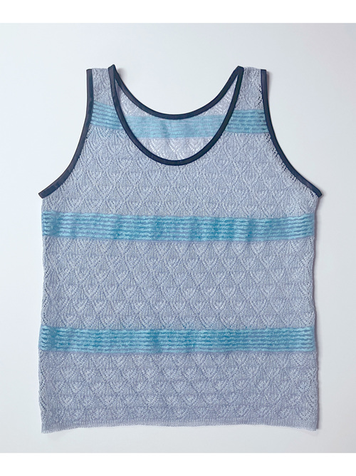ラメ糸のきらめきが美しいレースニットによるコンパクトなタンクトップ。