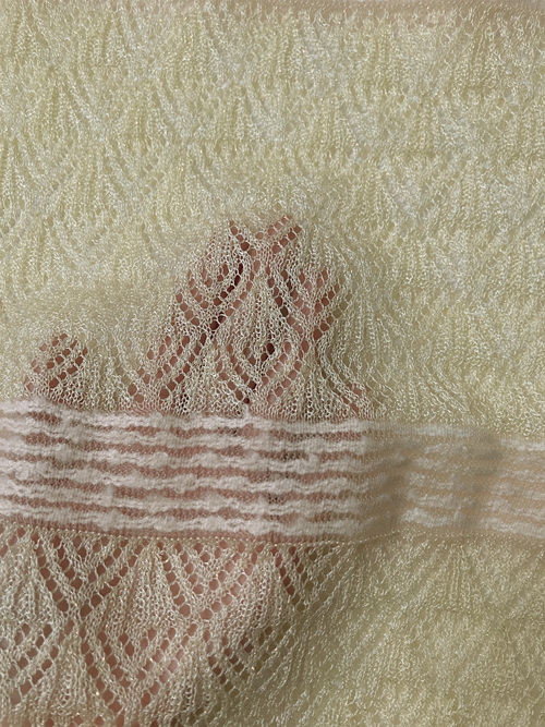 透明糸とニュアンス糸の編み替えのディテールのコントラストがポイント。