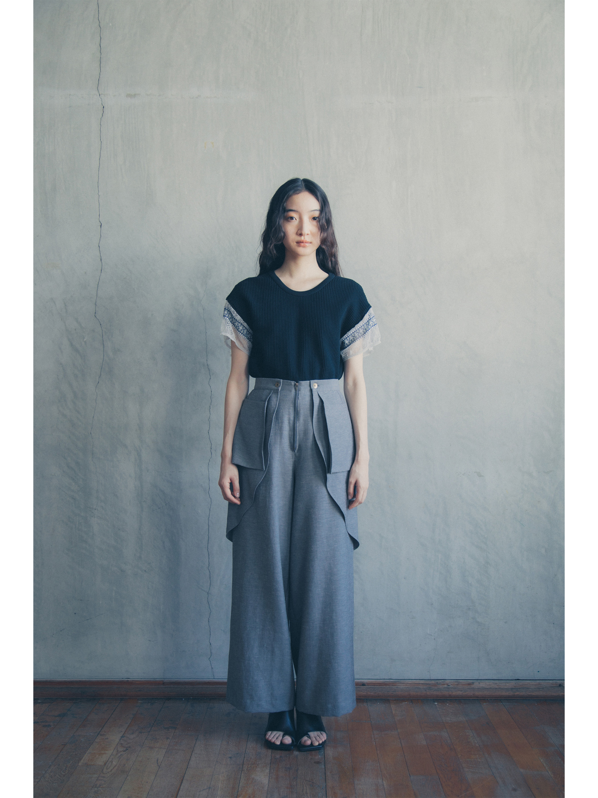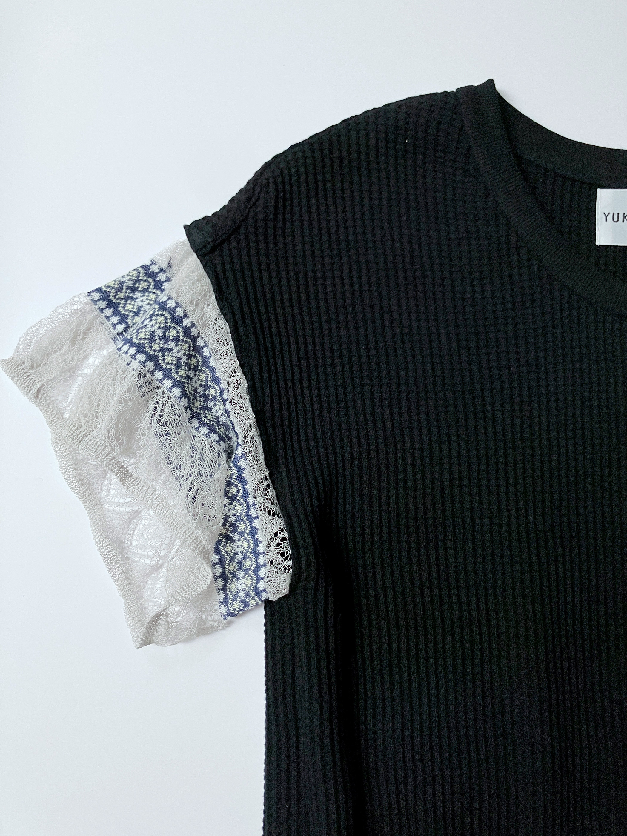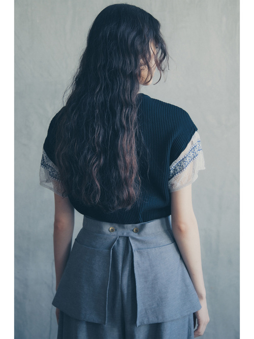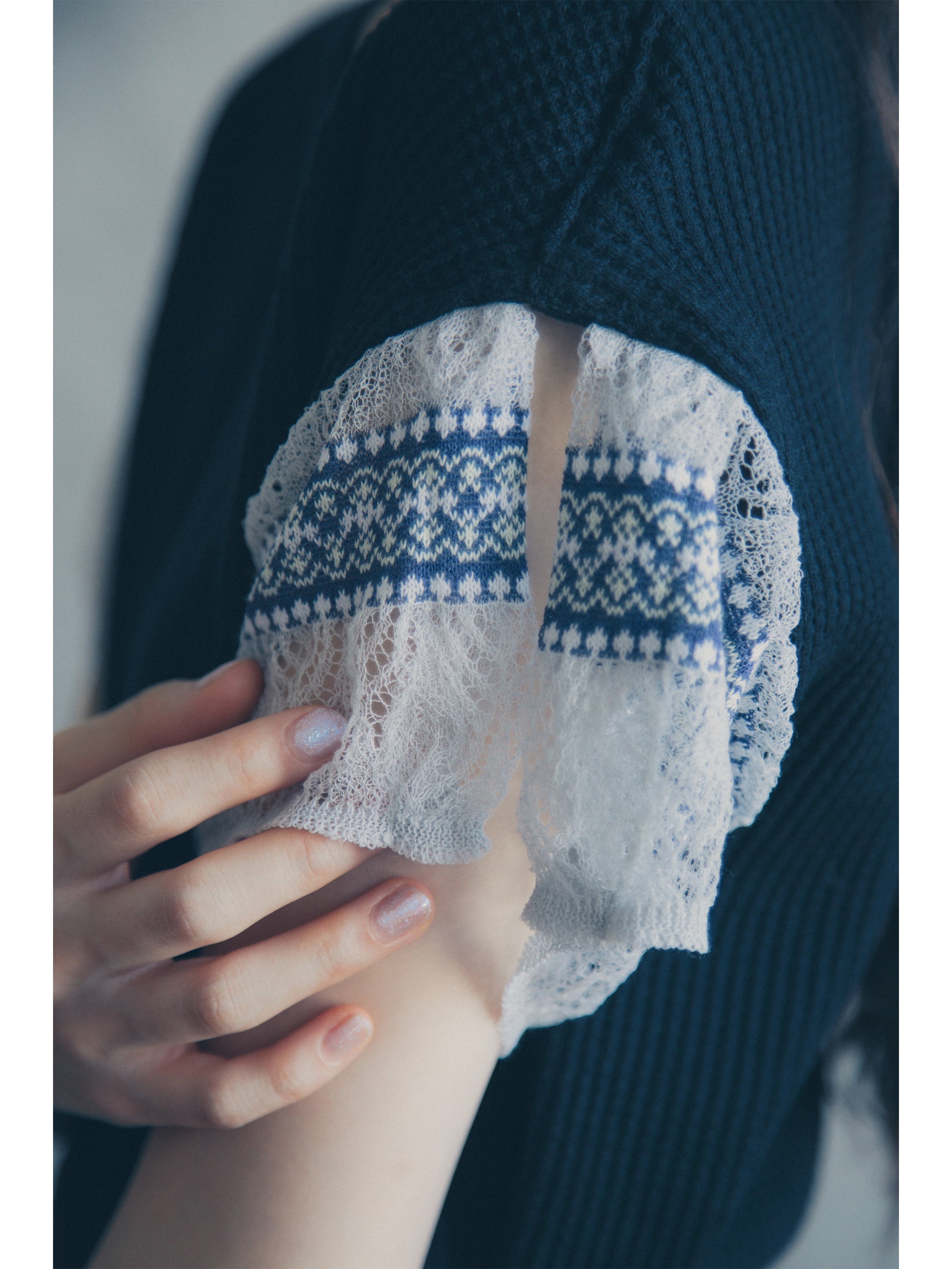 袖にはレースニットをドッキング。フォークロア調のチロリアンテープのような編み替えが全体のアクセントに。