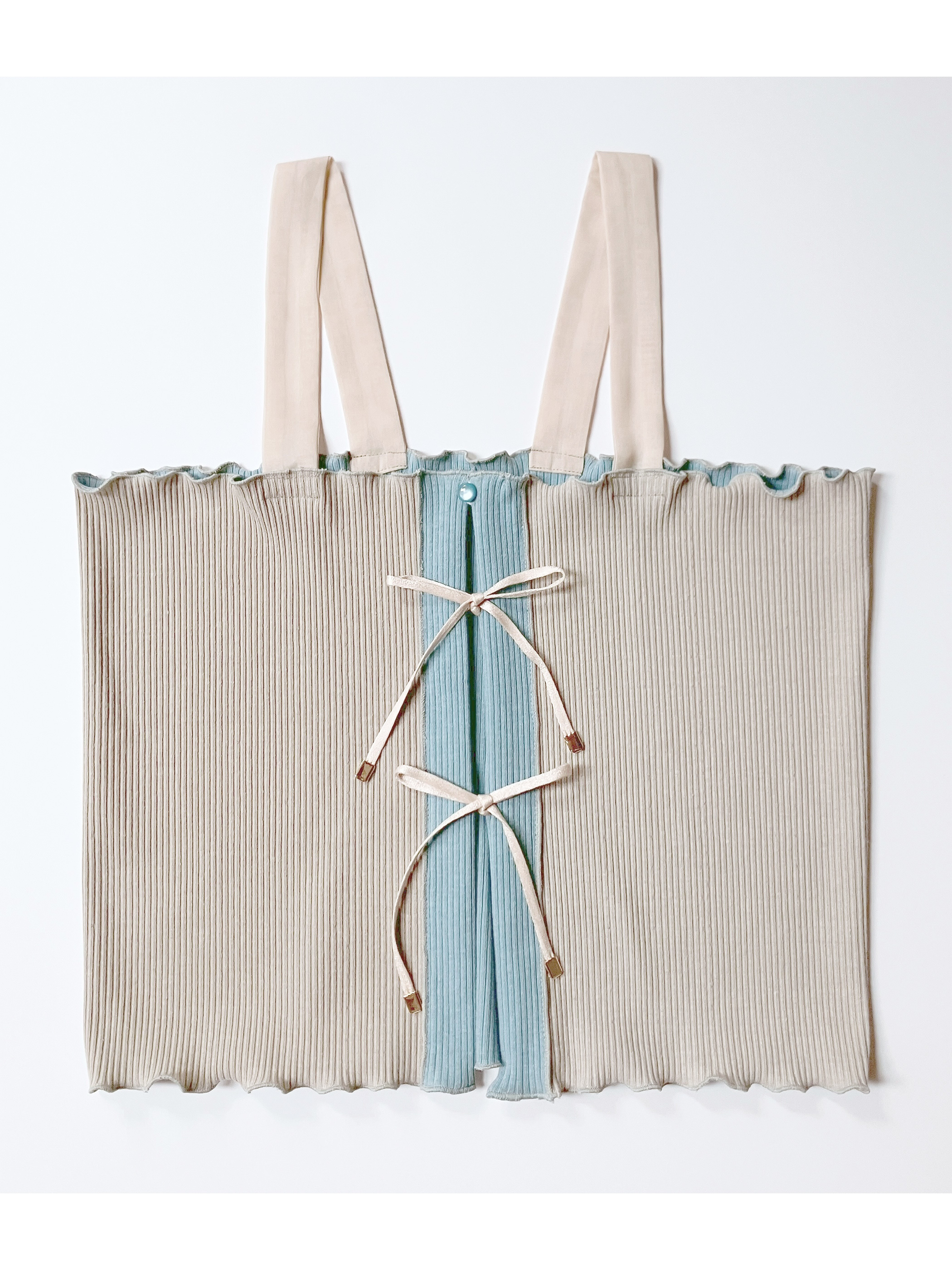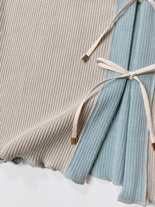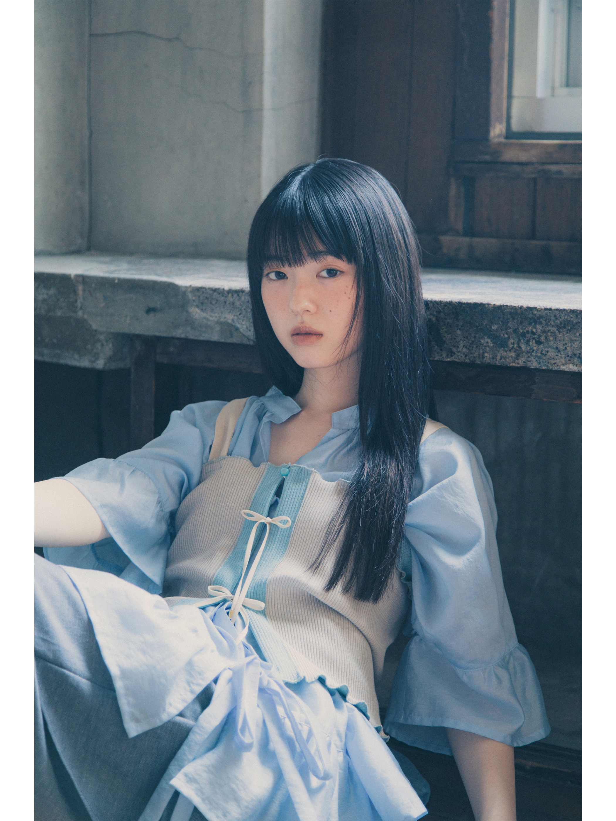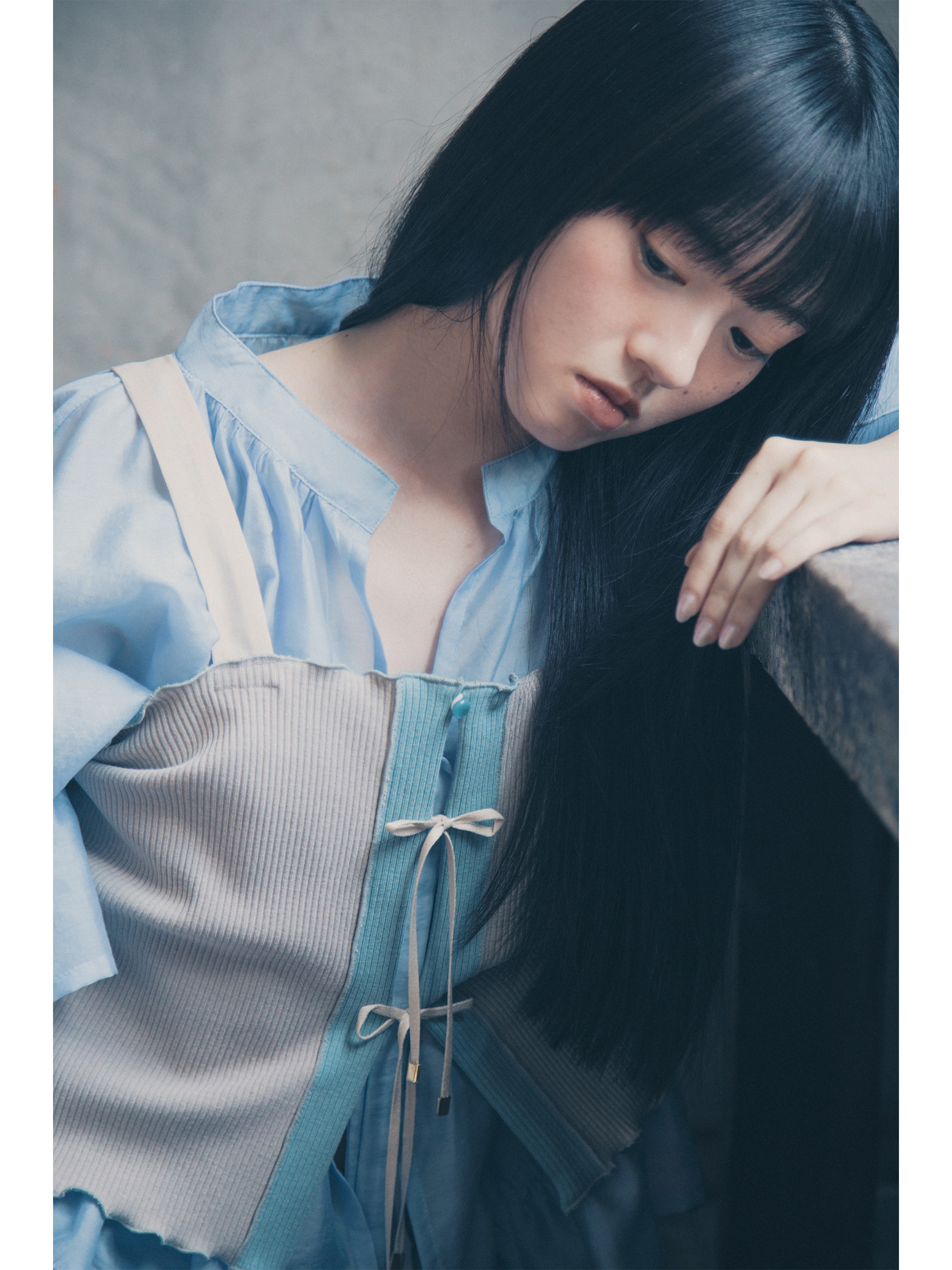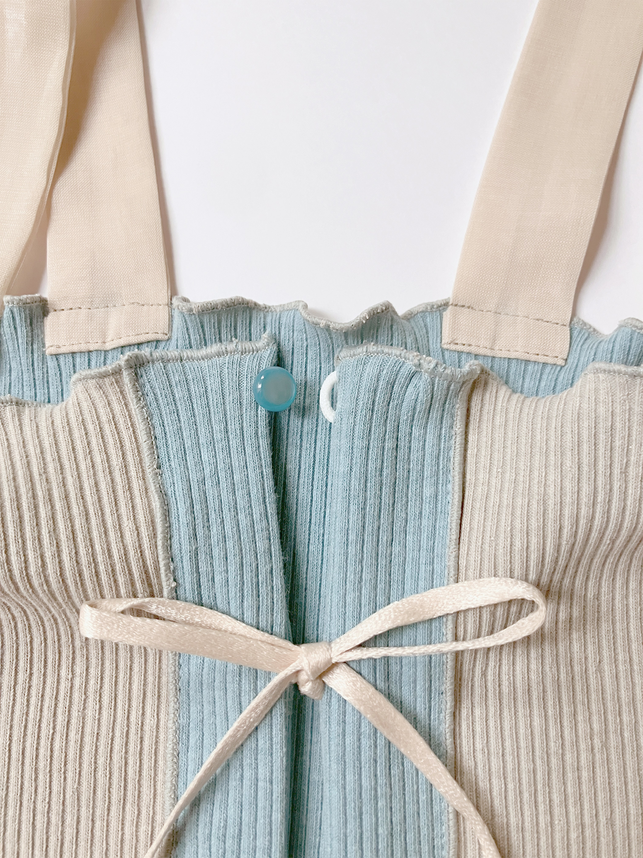 フロントを結んで着用します。トップにはさりげなく小さなボタンを。