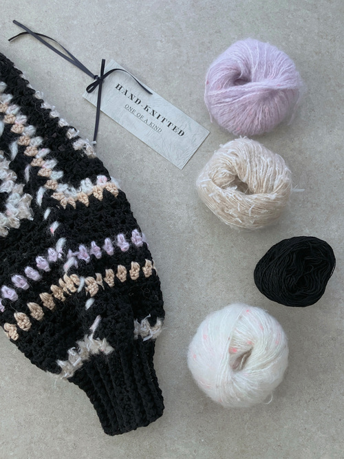 ブランドがもっとも信頼を置くハンドニッター/ニット作家のsheeper.knit氏に編み手を依頼し、糸の構成やデザインを決めていきました。